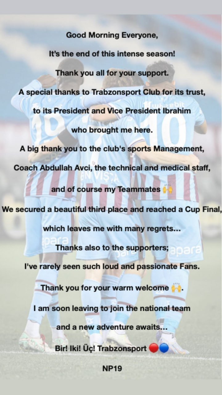 Bu sezonun sonu! Hepinize desteğiniz için teşekkür ederim. Beni buraya getiren Trabzonspor Kulübü'ne, başkanına ve başkan yardımcısı İbrahim Şahinkaya'ya güveninden dolayı özellikle teşekkür ediyorum. Teknik direktör Abdullah Avcı'ya, teknik ve sağlık ekibine ve tabii ki takım arkadaşlarıma çok teşekkür ederim. Güzel bir üçüncülük elde ettik ve pek çok pişmanlıkla hatırlayacağım kupa finaline ulaştık. Taraftarlara da teşekkürler; böylesine coşkulu ve tutkulu taraftarları nadiren gördüm. Sıcak karşılamanız için teşekkür ederim. Yakında milli takıma katılmak üzere ayrılıyorum ve yeni bir macera beni bekliyor....