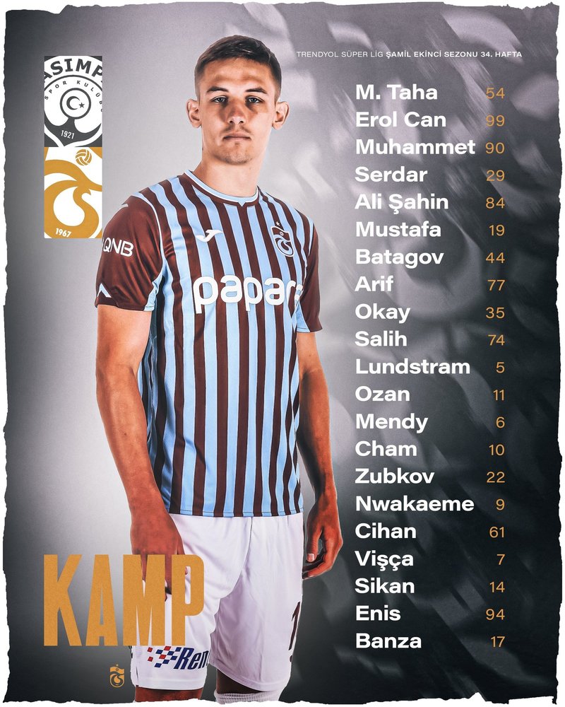 Trendyol Süper Lig'in 34. haftasında deplasmanda Kasımpaşa ile karşılaşacak olan Trabzonspor'un kamp kadrosu belli oldu.