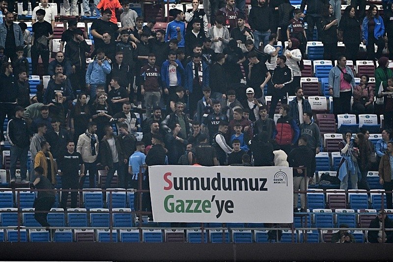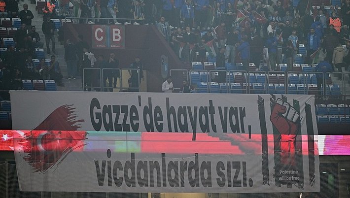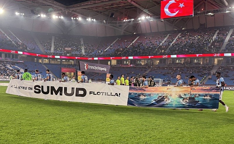 Trabzonsportaraftarları, Gazze'ye yardıma giden Sumud Filosu'na destek verdi. Bordo-mavili taraftarlar tribünlere Filistin'de Gazze'deki direnişe destek veren pankartlar astı. Dün akşam Kale arkasına asılan pankartlarda, "Gazze'de hayat var, vicdanlarda sızı" ve "Sumud'umuz Gazze'ye" yazılı pankartlar asıldı. Trabzonsporlu futbolcular da sahaya, "All Eyes Sumud Flotilla" yazılı pankart ile çıktı.