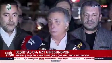 Beşiktaş Giresunspor maçı haberleri: Beşiktaş Başkanı Ahmet Nur Çebi, siyah beyazlıların Giresunspor'a 4-0 mağlup olduğu karşılaşma sonrası açıklamalarda bulundu. Çebi, "Aldığımız sonuç bizi ve camiayı son derece üzmüştür. Bu akşam buraya gelen taraftarımıza çok teşekkür ediyorum. Bize inandıkları ve inanmaya devam edecekleri için. Bu sorunların hepsini çözmeye hazır olduğumuzu camiaya söyleme ihtiyacı duyuyorum" dedi. Çebi, Sergen Yalçın'ın, 'Başkan ile oturup konuşacağız' sözleri sonrasında "Sergen Yalçın'ı dinledikten sonra gereken neyse onu yaparız. Eğer haklı gerekçeleri varsa, söyleyecek bir şeyimiz yok. Ayağa kalkıp yolumuza devam edecek bir anlayış görebilirsem ben onunla yola devam etmeyi tercih ederim" ifadelerini kullandı. İşte detaylar...
