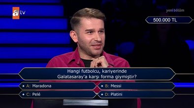 ATV ekranlarının sevilen yarışma programı Kim Milyoner Olmak İster'in son bölümünde yarışmacıya sorulan 500 bin TL'lik Galatasaray sorusu geceye damgasını vurdu. İşte sorunun yanıtı...
