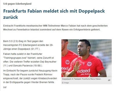 E.Frankfurt milli maçlar nedeniyle liglere ara verilmesini bir hazırlık maçı yaparak değerlendirdi. Ederbergland ile yapılan hazırlık maçında sahadan 5-0 üstün ayrılan Frankfurt'ta Marco Fabian oyuna 58. dakikada dahil oldu.
