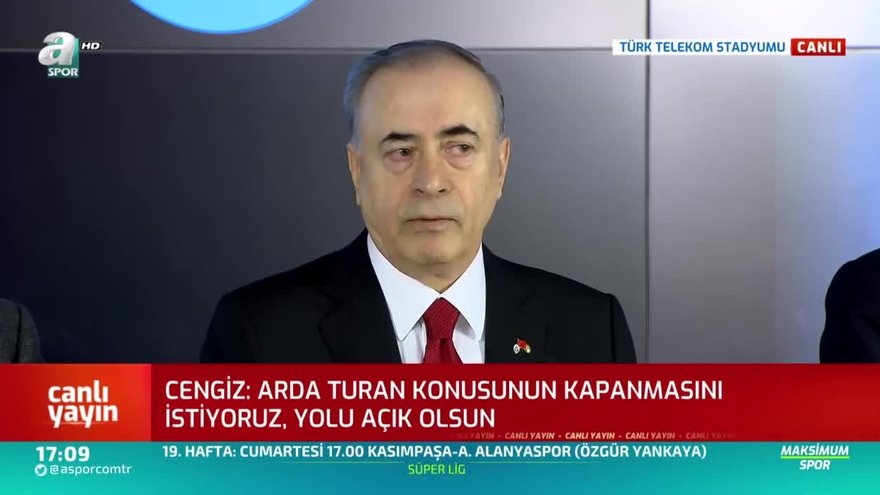 "Seçildiğimden beri gerçekçi olmayan, yani elinizde belge bilgi olmayan bir futbolcu transferiyle ilk defa karşılaşıyorum. Bunun için de sayın teknik direktörümüze hem telefonla hem de sözlü olarak açıklıkla ifade ettik ki gündemimizde yok. Sevgili camiama açık ve net olarak ifade ediyorum ki bu kardeşimiz şu andaki transfer planlamamızda yok. Bunu söylemekten bıktım. Aynı şeyin temcit pilavı gibi sürekli gündeme gelmesinden hem camia hem de yönetim olarak müthiş rahatsızız. Bu konunun kapanmasını istiyoruz. Arda Turan kulübümüze hizmet etmiş, zamanında para kazandırmış, Galatasaray için eylemlerde bulunmuştur. Galatasaray'da olduğu için bu unvanları hak etmiş bir kardeşimiz. Ben yolunun açık olmasını diliyorum. Özel olarak hiçbir husumetimiz ve kastımız yok. Ona yaşamında sonsuz sağlıklı, hayırlı yıllar diliyorum."