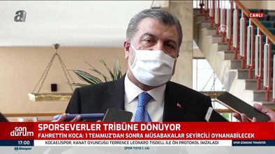 Sağlık Bakanı Fahrettin Koca'dan gelecek sezon düzenlenecek spor müsabakalarına seyirci alınıp alınmayacağına dair müjde geldi. Bakan Koca, "1 Temmuz'dan sonra spor müsabakaları, sayıları belirlenerek tedbirlerle seyircili oynanabilecek." şeklinde konuştu.