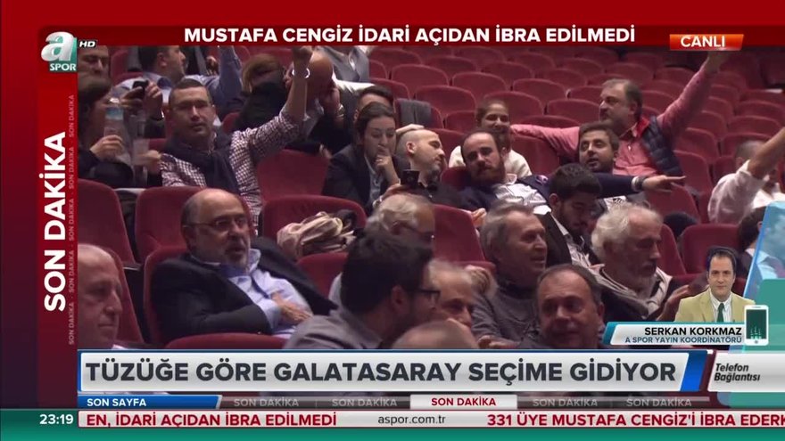 Galatasaray'da Mustafa Cengiz yönetimi mali yönden ibra edilirken, idari yönden ibra edilmedi. 331 üye, Mustafa Cengiz'i ibra ederken, 358 üye ibra etmedi. Tüzüğe göre seçime gidecek olan Galatasaray'da mevcut başkan Mustafa Cengiz, bir seçim dönemi geçmeden adaylığını koyamayacak. Son Sayfa programına telefonla bağlanan A Spor Yayın Koordinatörü Serkan Korkmaz, Galatasaray'daki seçim kararını değerlendirdi. Korkmaz, mevcut yönetimin seçime gitmemeye çalışacağını söyledi.