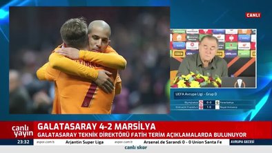 Galatasaray UEFA Avrupa Ligi'nde , Marsilya'yı kendi sahasında 4-2 mağlup etti ve grubundan çıkmayı garantiledi. Teknik direktör Fatih Terim maç sonunda ligde gördüğü kırmızı kart hakkında konuştu. Terim, "O konuya şimdi girmek istemiyorum. Cezalarımız açıklansın. Ondan sonra gerektiği şekilde cevap veririz. Şunu da söyleyeyim, benim Avrupa'da kulüp bazında atılmışlığım bir tane. O da İtalya'da. Türk hakem." dedi.