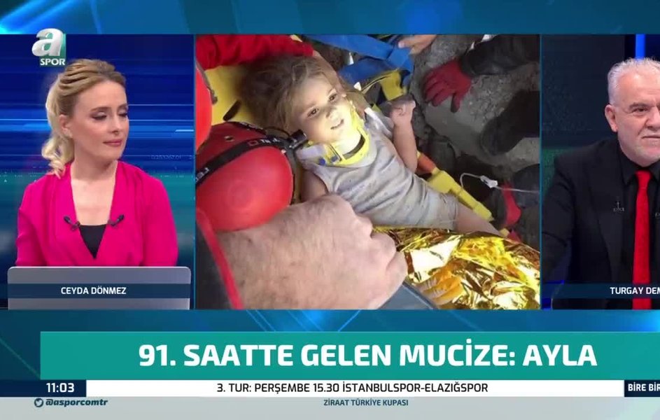 İzmir'de yaşanan 6.6 büyüklüğündeki depremden tam 91 saat sonra Rıza Bey Apartmanı enkazından mucize bir şekilde çıkarılan Ayda bebek ile ilgili konuşan A Spor yorumcusu Turgay Demir, "Bu anlayabileceğimiz bir duygu değil. Bunu anlayabilecek iki kişi var, birisi annesi birisi babası. İşte mucize" ifadelerini kullandı.