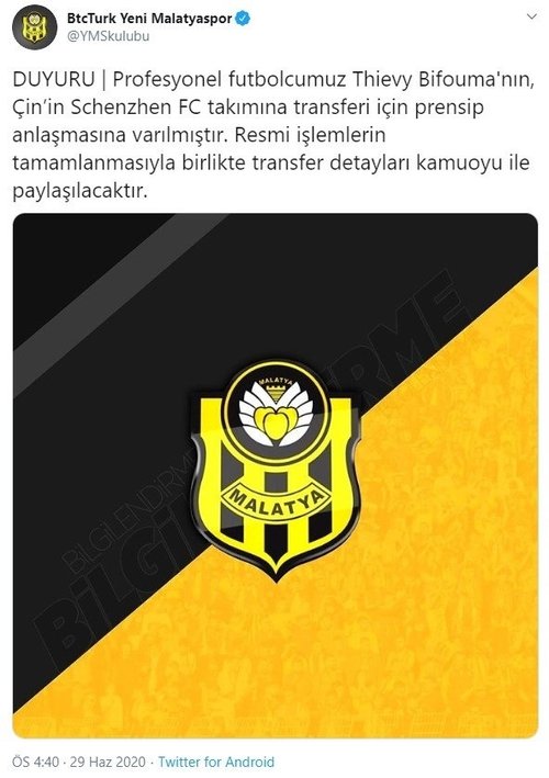 "Profesyonel futbolcumuz Thievy Bifouma'nın, Çin'in Schenzhen FC takımına transferi için prensip anlaşmasına varılmıştır. Resmi işlemlerin tamamlanmasıyla birlikte transfer detayları kamuoyu ile paylaşılacaktır."