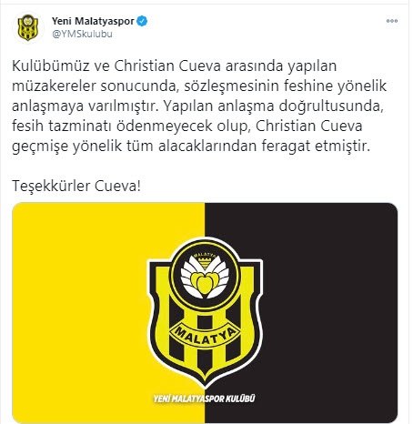 Kulübümüz ve Christian Cueva arasında yapılan müzakereler sonucunda, sözleşmesinin feshine yönelik anlaşmaya varılmıştır. Yapılan anlaşma doğrultusunda, fesih tazminatı ödenmeyecek olup, Christian Cueva geçmişe yönelik tüm alacaklarından feragat etmiştir. Teşekkürler Cueva!